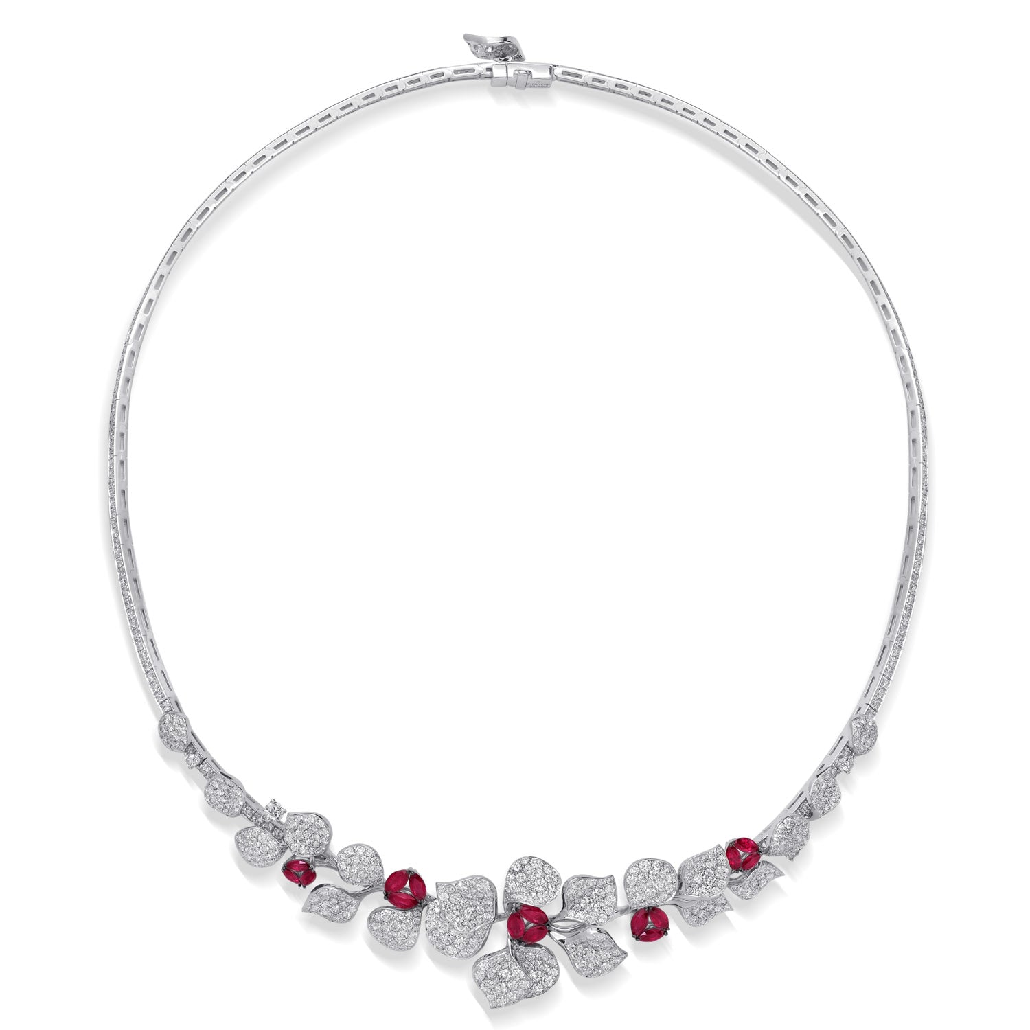 قلادة À Fleur de Paris Ruby Collier هي احتفال متألق بالربيع الباريسي، وتتميز بترتيب دقيق من بتلات الزهور المتفتحة. صُنعت هذه القلادة من الذهب عيار 18 قيراطًا، وتتميز بسلسلة معقدة من الزهور الماسية المرصعة بالأحجار الكريمة، وتتلألأ بتلاتها ببريق. تضيف الياقوتات النابضة بالحياة المقطوعة على شكل ماركيز في قلب كل زهرة لمسة مذهلة من اللون، ترمز إلى العاطفة والحيوية. صُممت هذه القلادة بتصميم أنيق ومناسب، وهي تنضح بالرقي الخالد وهي مثالية للتعبير عن نفسك في أي مناسبة.