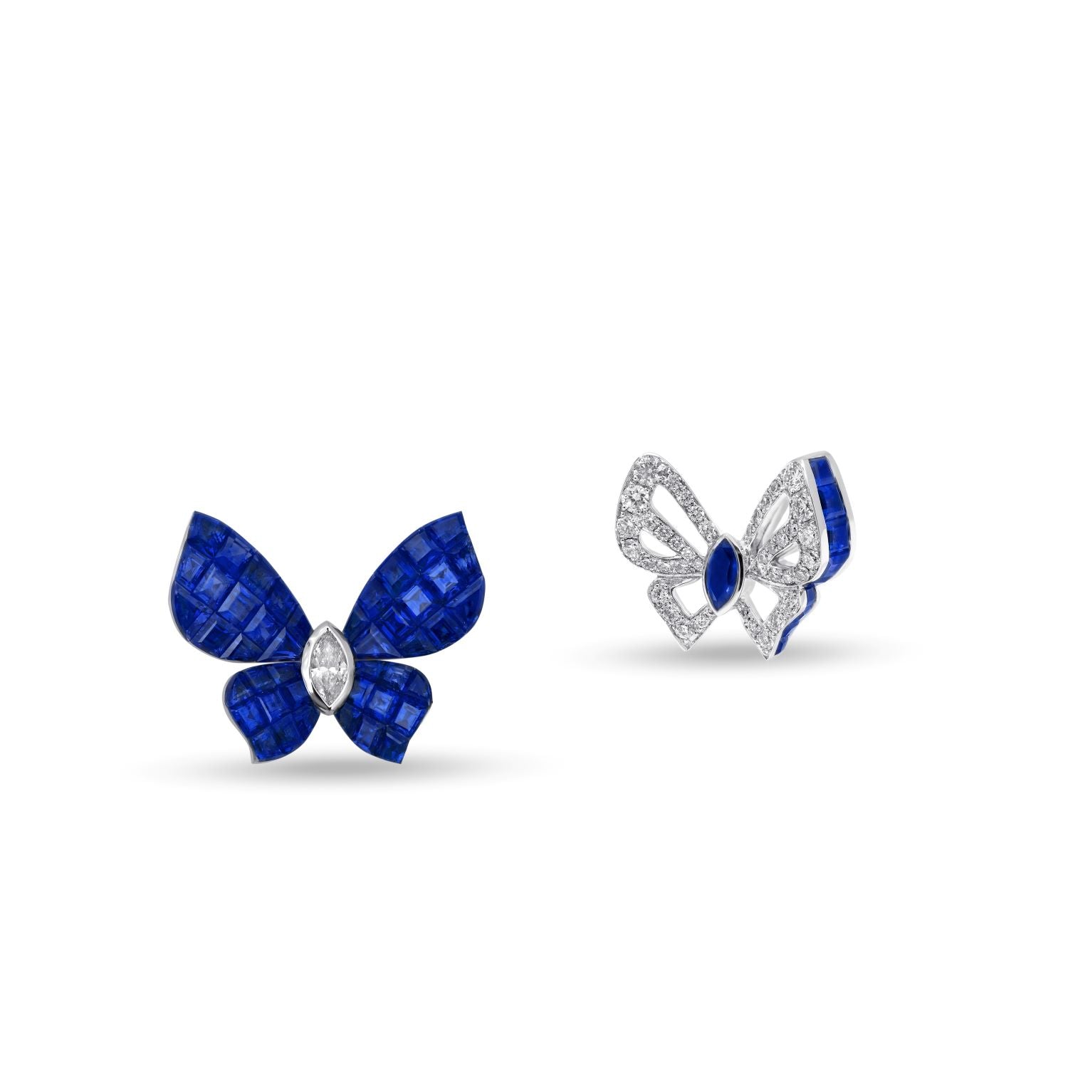 Feine Linien aus unsichtbar gefassten blauen Saphiren zeichnen die filigranen Flügeladern nach, während ein einzelner Marquise-Diamant oder ein farbiger Edelstein den Körper des Schmetterlings formt.
