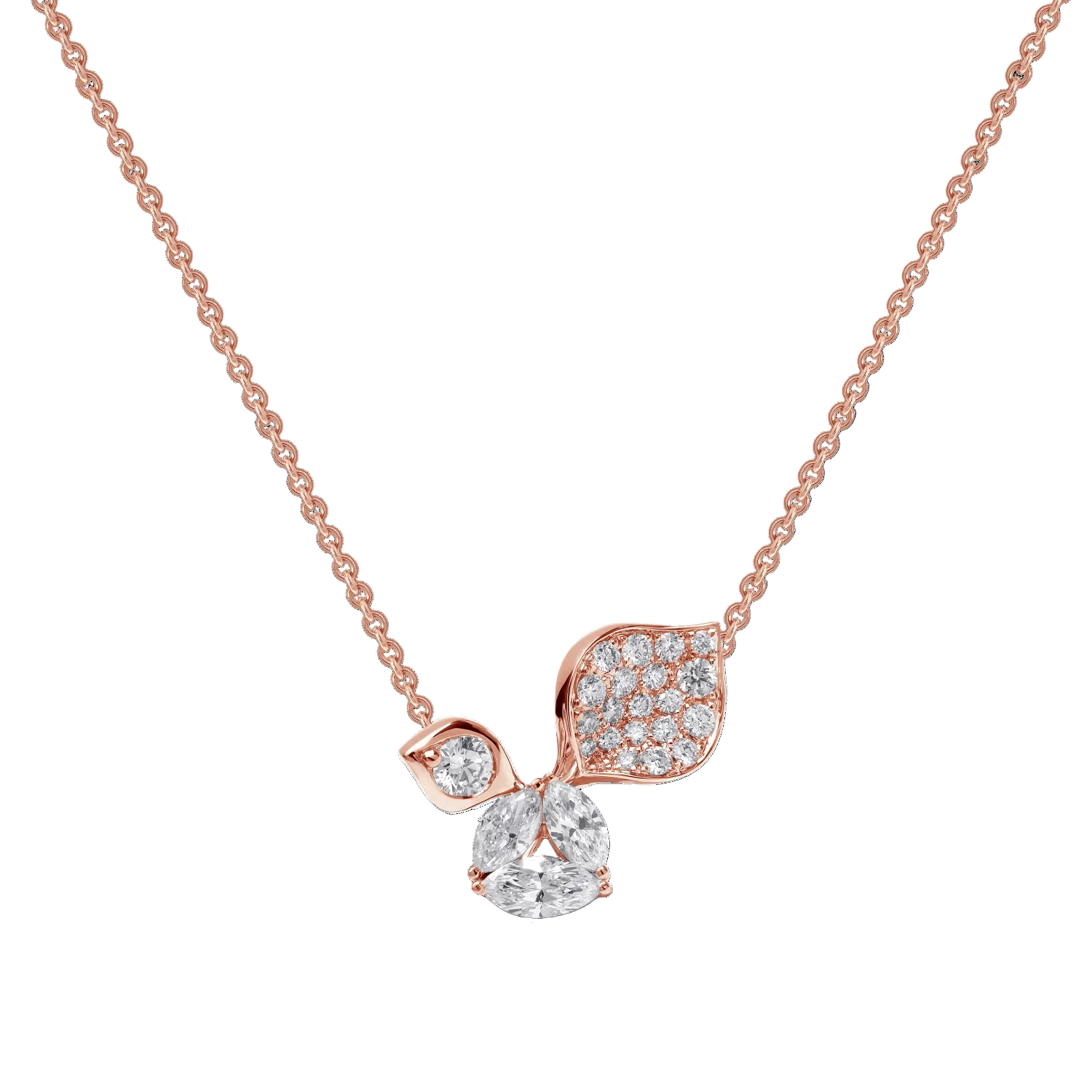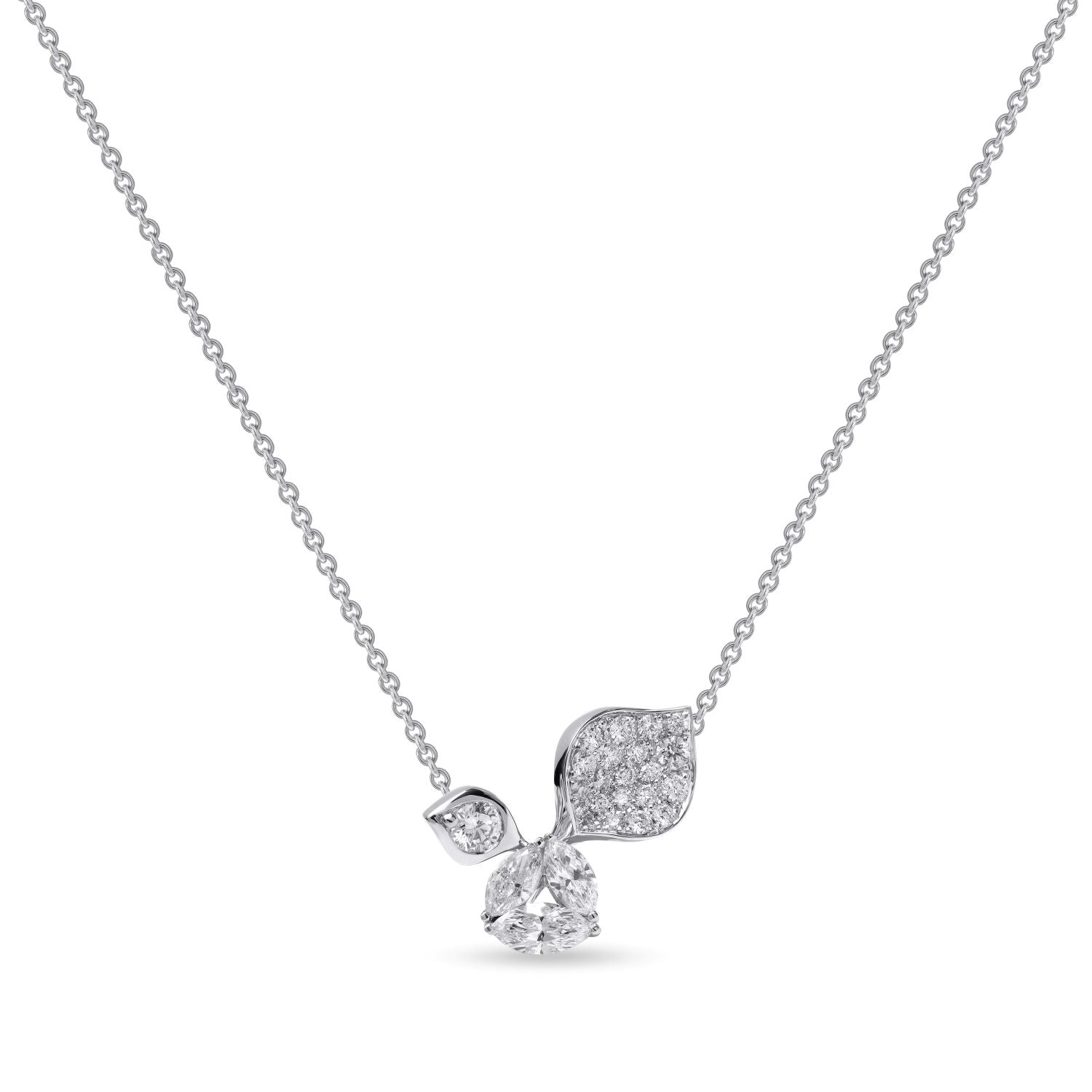 Die Halskette À Fleur de Paris ist eine raffinierte Hommage an die zarte Schönheit des Frühlings. Der Anhänger zeigt ein anmutig geschwungenes, mit Diamanten besetztes Blütenblatt, das in der Mitte von drei Diamanten im Marquise-Schliff akzentuiert wird. An einer verstellbaren Kette aus 18 Karat Gold aufgehängt, verbindet dieses Collier zeitlosen Charme mit moderner Vielseitigkeit.