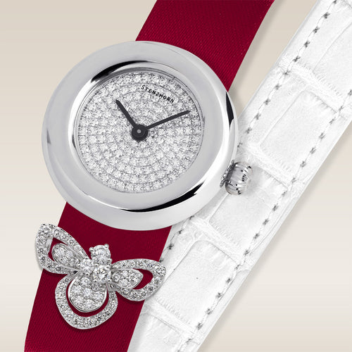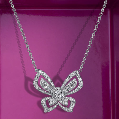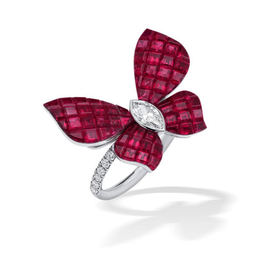 Fine rails of invisible-set blue sapphires trace the delicate veins of the butterfly’s wings, while a single marquise-cut diamond or vibrant coloured gemstone forms its graceful body.