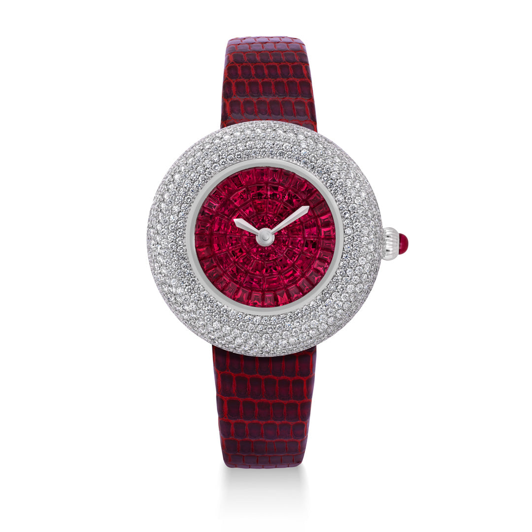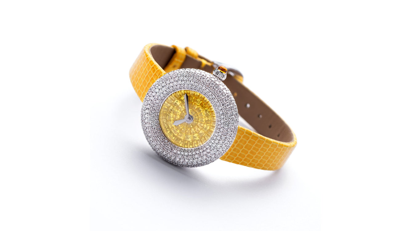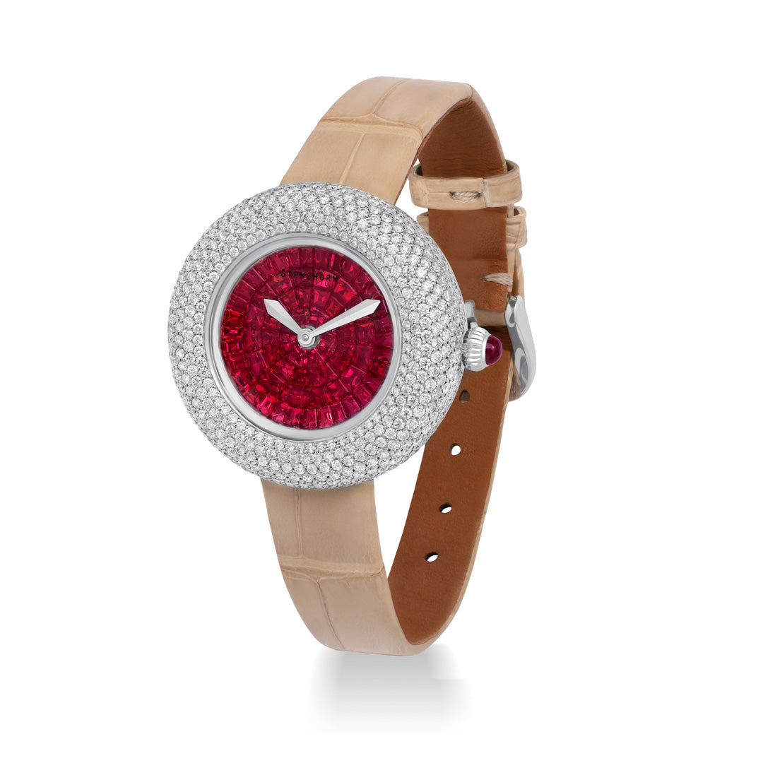 Crafted with meticulous attention to detail, the Mosaic Watch features a stunning invisible-set precious stone dial, framed by an exquisite 18k white gold and diamond pavé bezel. The crown is adorned with a matching precious cabochon, adding an extra touch of opulence to this already mesmerising creation. The harmonious blend of geometric and classical shapes results in a perfectly balanced design that captures the essence of femininity.