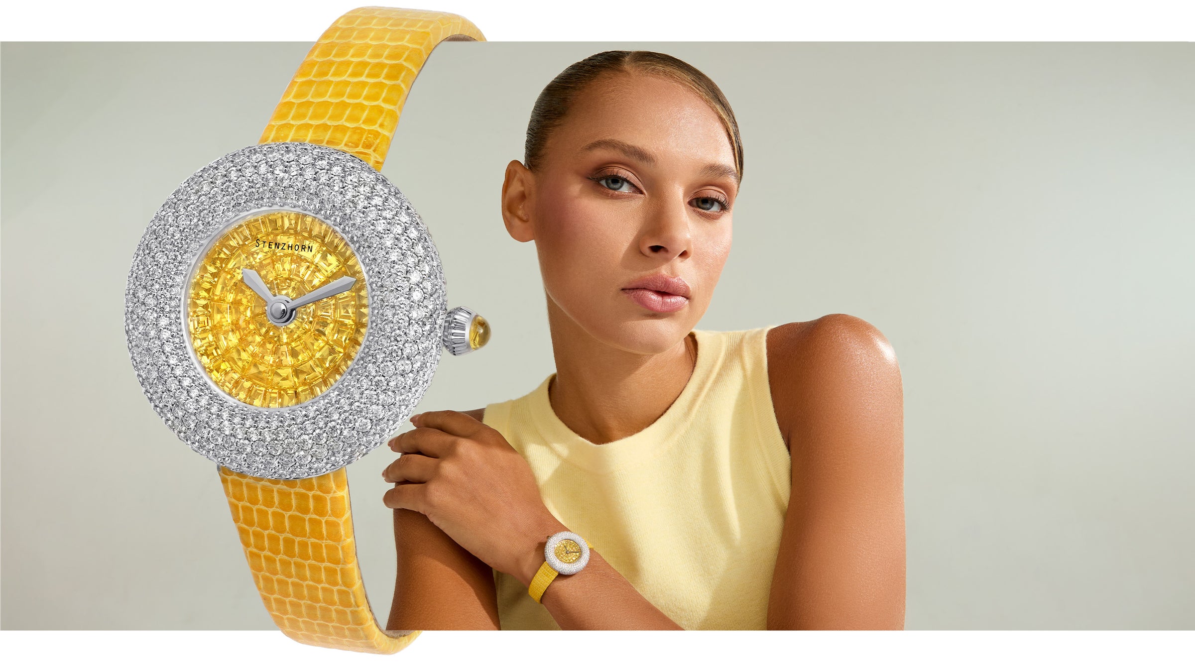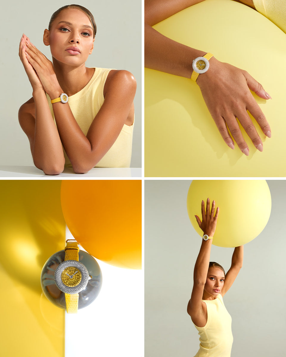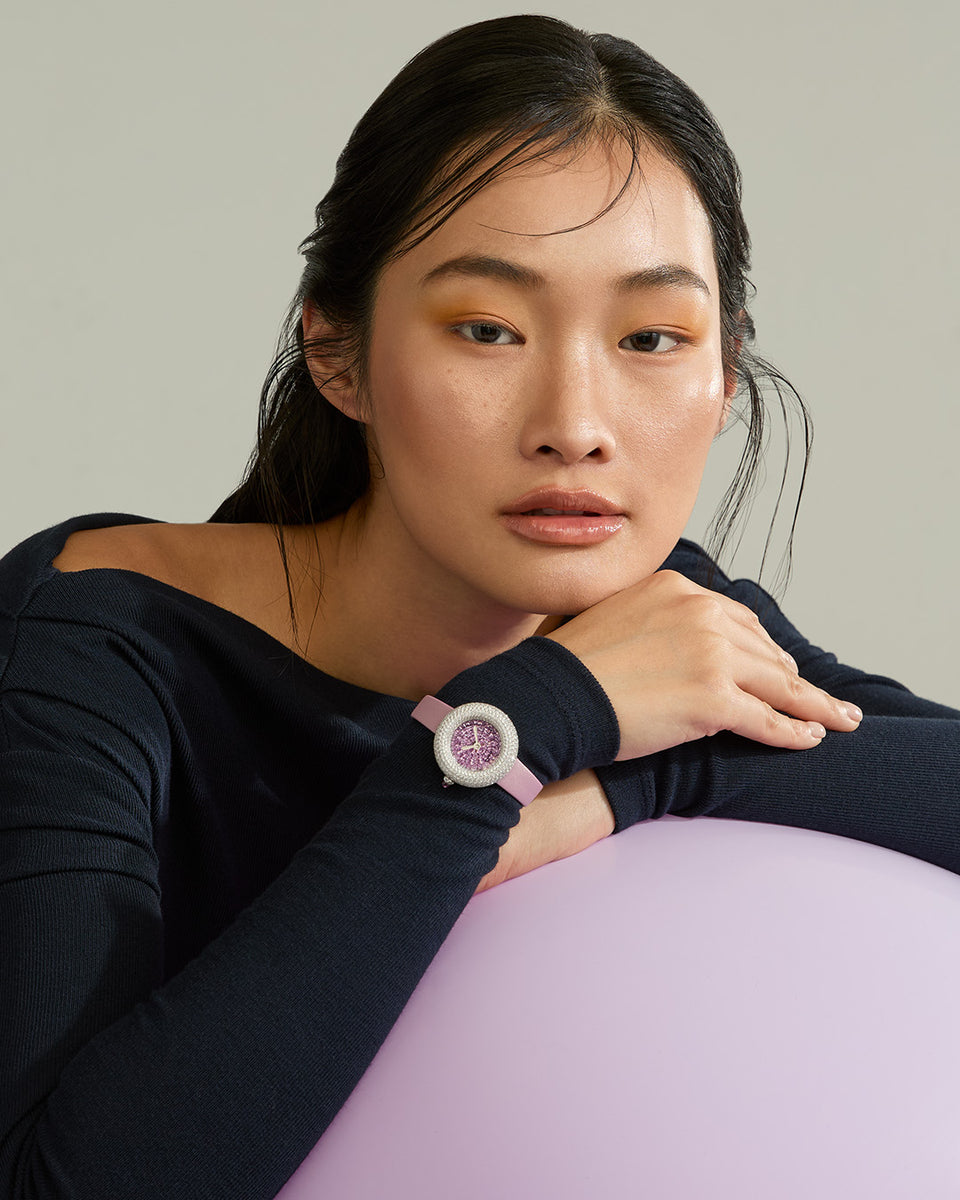 Crafted with meticulous attention to detail, the Mosaic Watch features a stunning invisible-set precious stone dial, framed by an exquisite 18k white gold and diamond pavé bezel. The crown is adorned with a matching precious cabochon, adding an extra touch of opulence to this already mesmerising creation. The harmonious blend of geometric and classical shapes results in a perfectly balanced design that captures the essence of femininity.