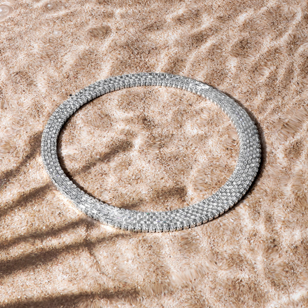 One of the most impressive pieces in the collection is the “Antartide” necklace, which takes the form of a wide strip of ice around the base of the neck.