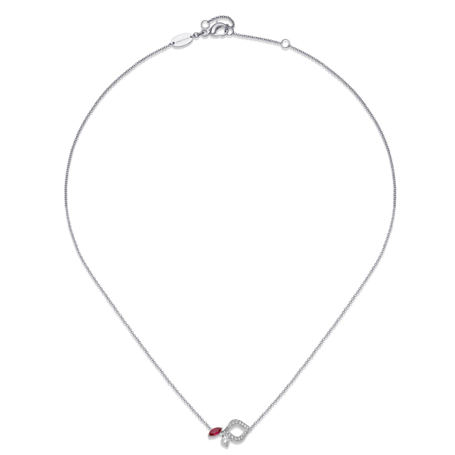 The À Fleur de Paris Petite Necklace is a refined yet simple piece, perfect for everyday elegance. Featuring a single marquise-cut ruby and a delicate pavé diamond-outlined leaf, this necklace is crafted in 18k gold and designed to add a touch of sophistication to any outfit. Its lightweight design makes it ideal for layering or wearing alone as a subtle statement of charm.