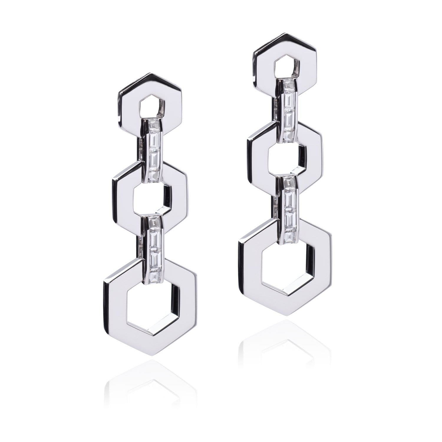Elongated channel-set baguette diamonds reflect the shimmering droplets of sweet nectar creating a stylishly modern, geometric linear feel.