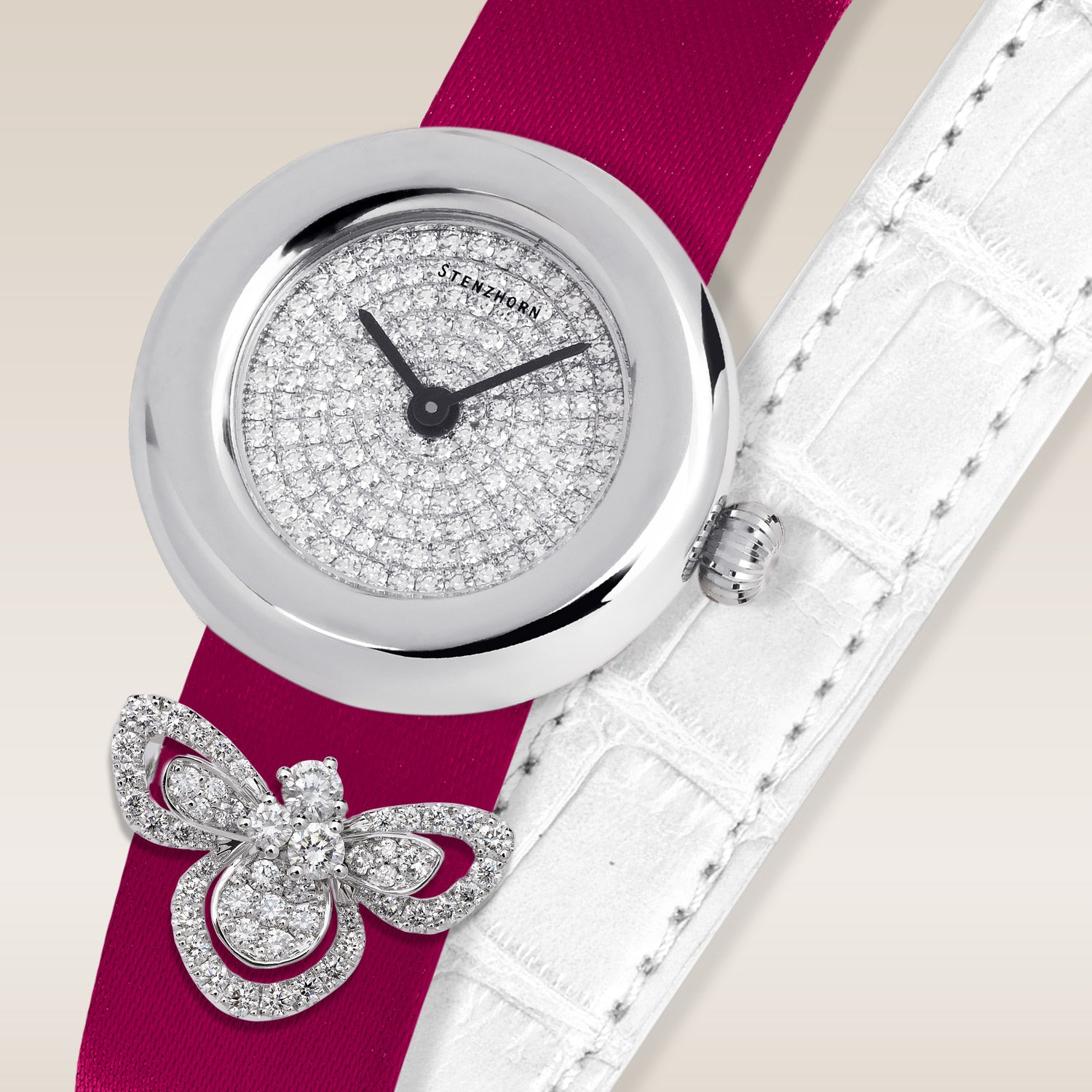 ステンツホルンが自信を持ってお届けする、遊び心に溢れ、様々なアレンジが可能な新しいウォッチコレクション「ブーケ」。すべてのレザーバンドは交換可能で、カラーバリエーションも豊富です。18Kゴールドのオーナメントをスライドさせるだけで、時計のレザーストラップを個性的に仕上げることができます。