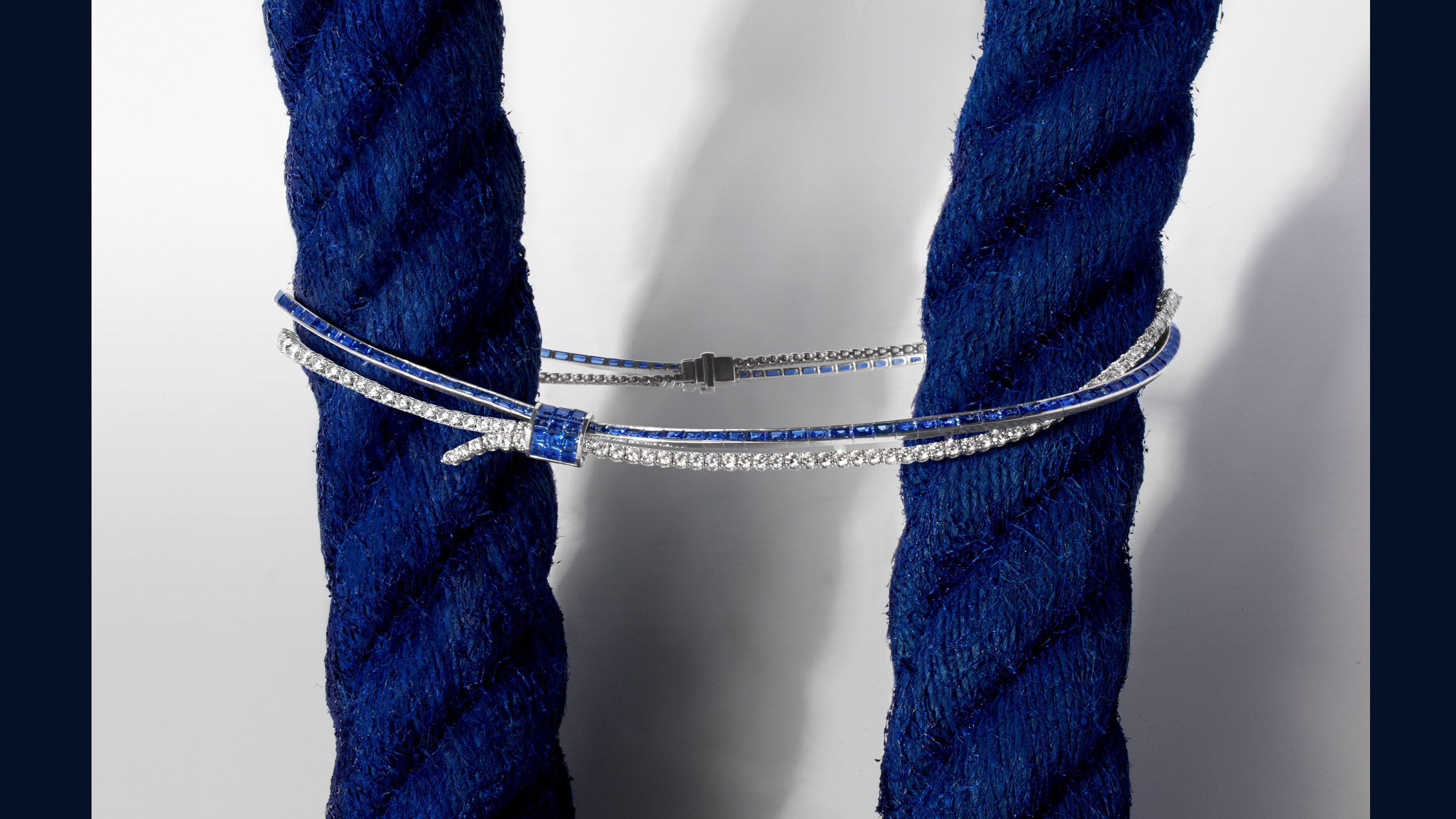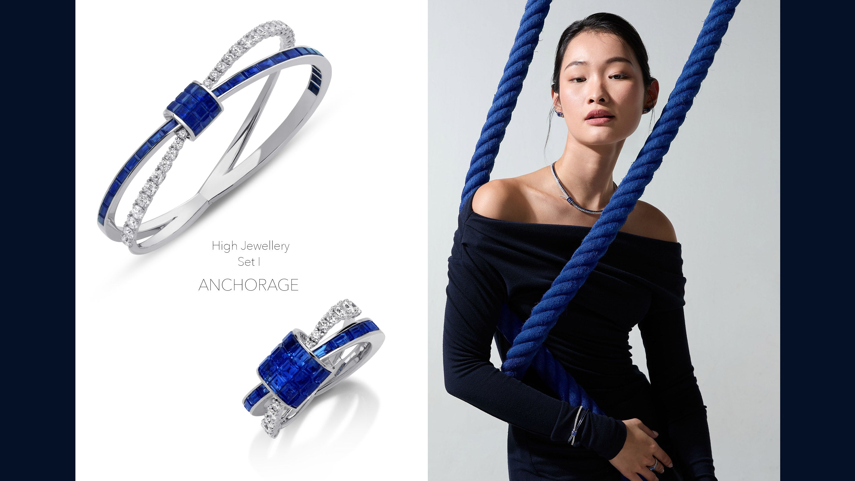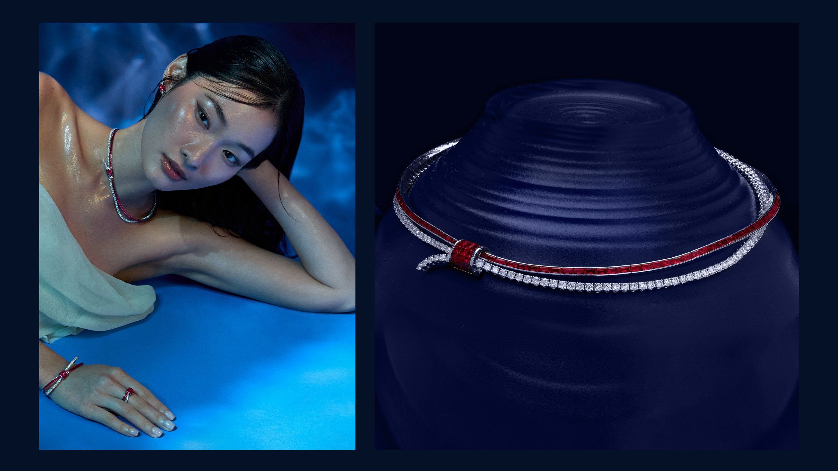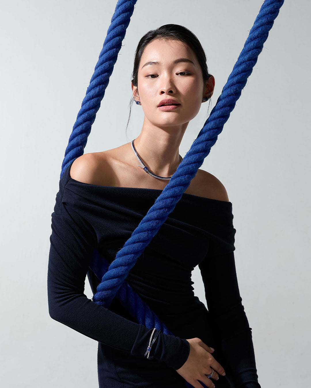 HOLD ON TIGHT』の代表作であるこのネックレスは、物語のエモーショナルな核心を体現している。その中心には、見えないようにセッティングされた3列のダイヤモンドまたはルビーで作られた結び目があり、回復力とつながりの象徴となっている。そこから繊細な紐が緩んだロープのように広がり、解放の瞬間、力強さ、自分の道への信頼を呼び起こす。この作品は、持ち続け、手放すために必要な静かな勇気を反映している。