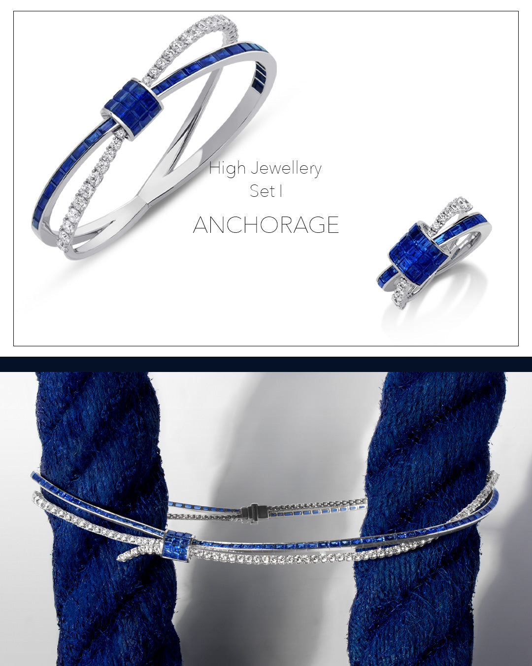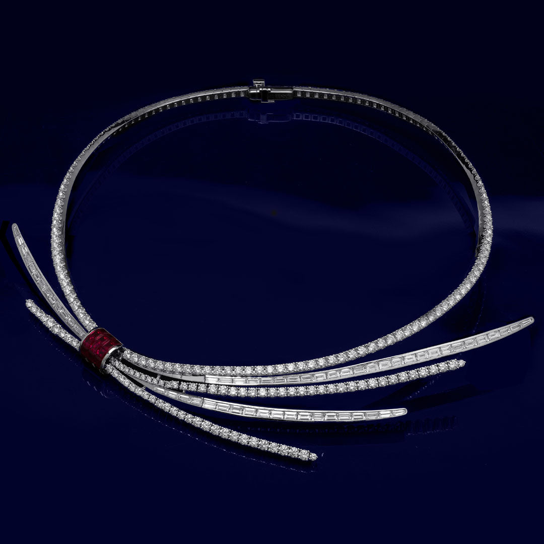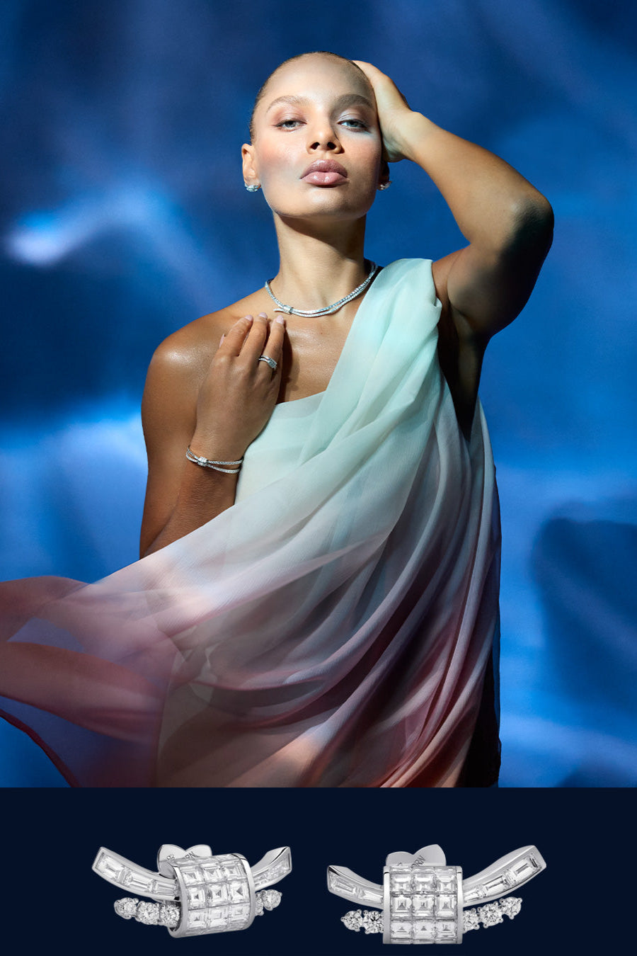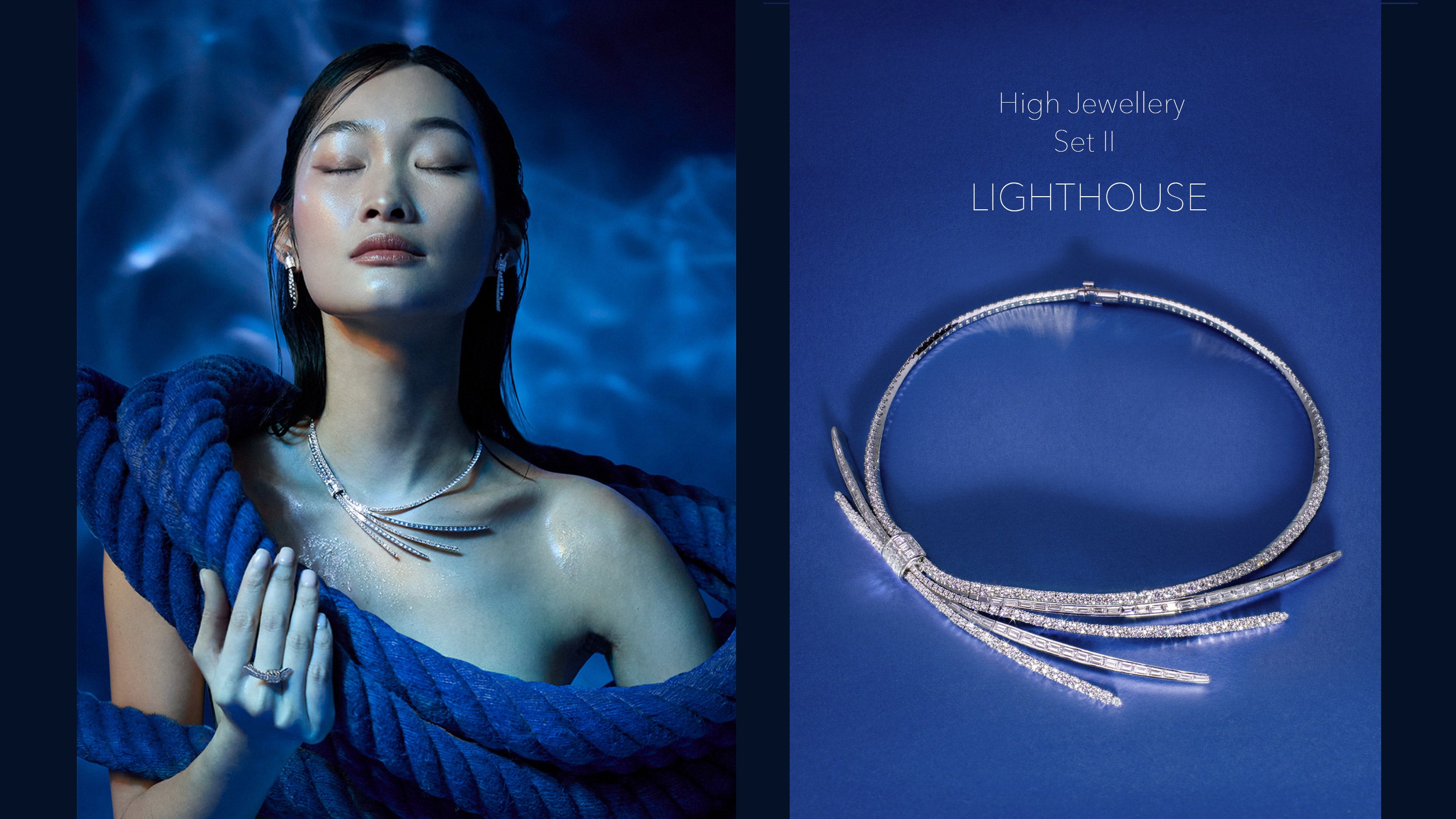 HOLD ON TIGHT』の代表作であるこのネックレスは、物語のエモーショナルな核心を体現している。その中心には、見えないようにセッティングされた3列のダイヤモンドまたはルビーで作られた結び目があり、回復力とつながりの象徴となっている。そこから繊細な紐が緩んだロープのように広がり、解放の瞬間、力強さ、自分の道への信頼を呼び起こす。この作品は、持ち続け、手放すために必要な静かな勇気を反映している。