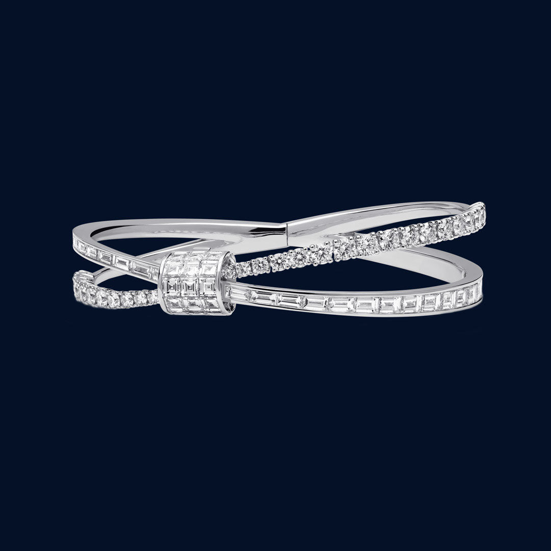 伝統的なデザインとは異なり、結び目は意図的に中心からずらした位置にあり、現代的で予想外のバランスをもたらしている。その織り込まれた構造は、絡み合ったロープの動きを模しており、流れるように交差し、さまざまなセッティング技法によって、2本のストランドのコントラストとダイナミックな相互作用が強調されています。