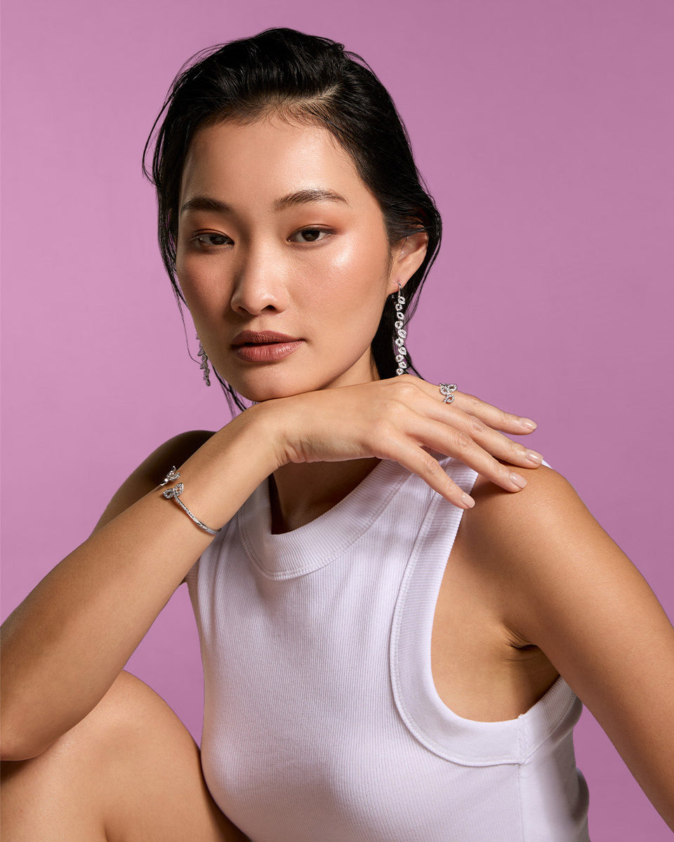 Stellen Sie sich vor, Sie spazieren durch einen heiteren Garten in Paris, in dem die Luft von dem süßen Duft blühender Blumen erfüllt ist, die sich anmutig in einer warmen Brise wiegen. Jedes Stück dieser bezaubernden Kollektion erzählt eine Geschichte von zarten Blütenknospen, die sich zur vollen Blüte entfalten und dabei eine exquisite Anmut und ätherische Leichtigkeit bewahren. Die Kollektion spiegelt dieses poetische Bild mit verspielten Designs wider, die mit schillernden Diamanten verziert sind, die wie Tautropfen auf zarten Blütenblättern schimmern.