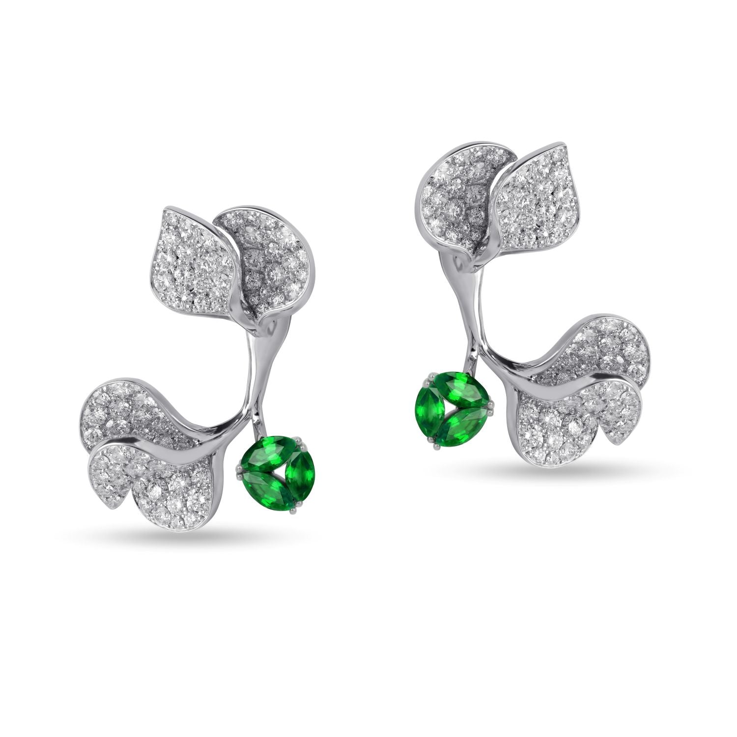 Die Ohrringe À Fleur de Paris verkörpern die Essenz des erwachenden Frühlings. Die Blütenblätter entfalten sich anmutig und enthüllen leuchtende Farben und Brillanz. Die aus 18 Karat Gold gefertigten Ohrringe bestehen aus zart geschwungenen Blütenblättern, die mit Diamanten in Pavé-Fassung besetzt sind und vor Leben schimmern. Im Herzen jeder Blüte bilden drei Tsavoriten im Marquiseschliff einen markanten Mittelpunkt, der für Leidenschaft und Vitalität steht. Die perfekte Balance zwischen zeitloser Eleganz und frischem, modernem Design macht diese Ohrringe zu einer strahlenden Hommage an die Schönheit von Erneuerung und Romantik.