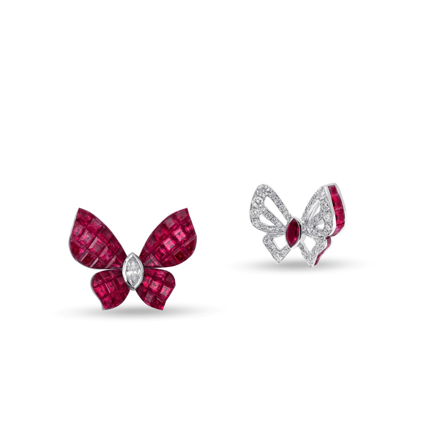 Feine Linien aus unsichtbar gefassten Diamanten zeichnen die filigranen Flügeladern nach, während ein einzelner Marquise-Diamant oder ein farbiger Edelstein den Körper des Schmetterlings formt.