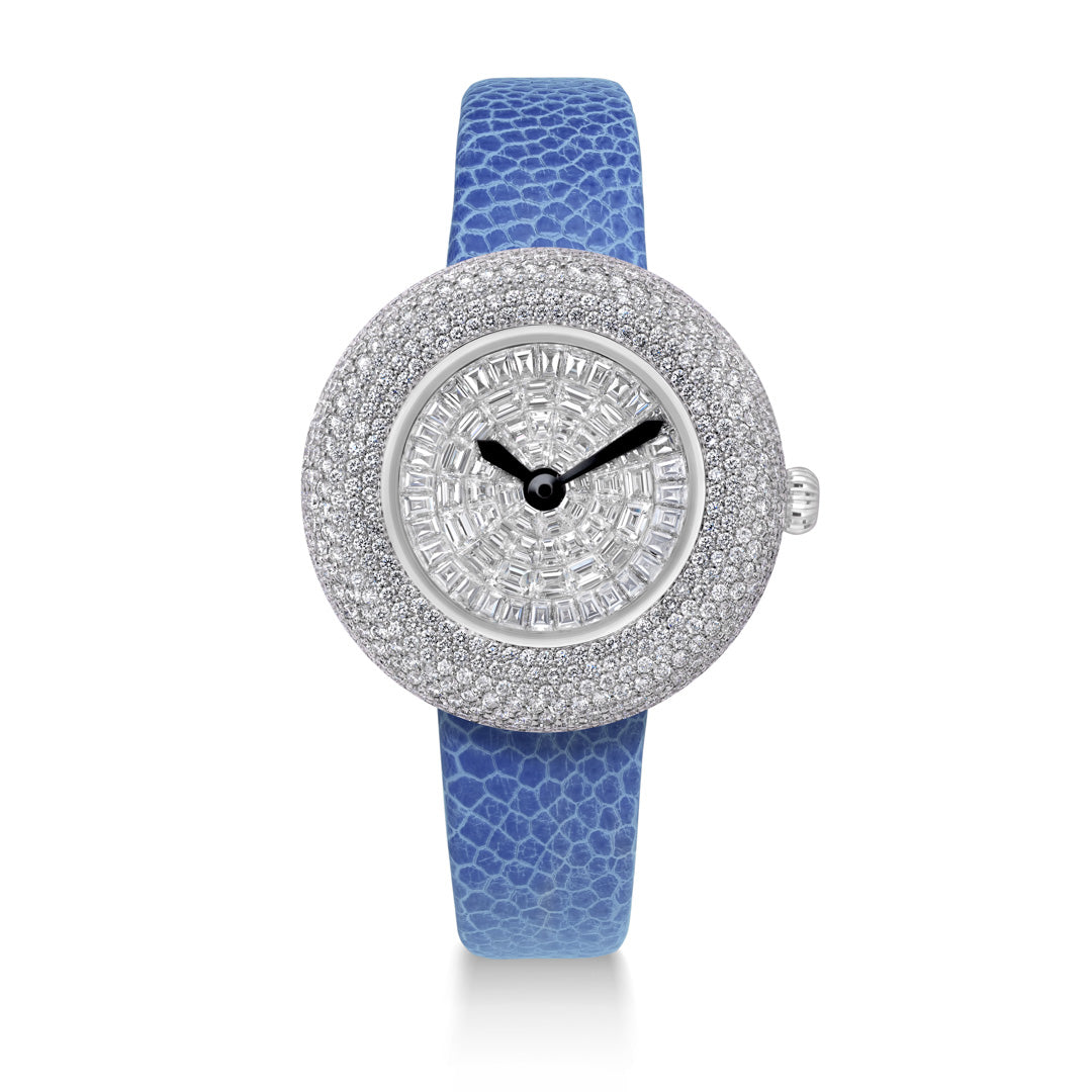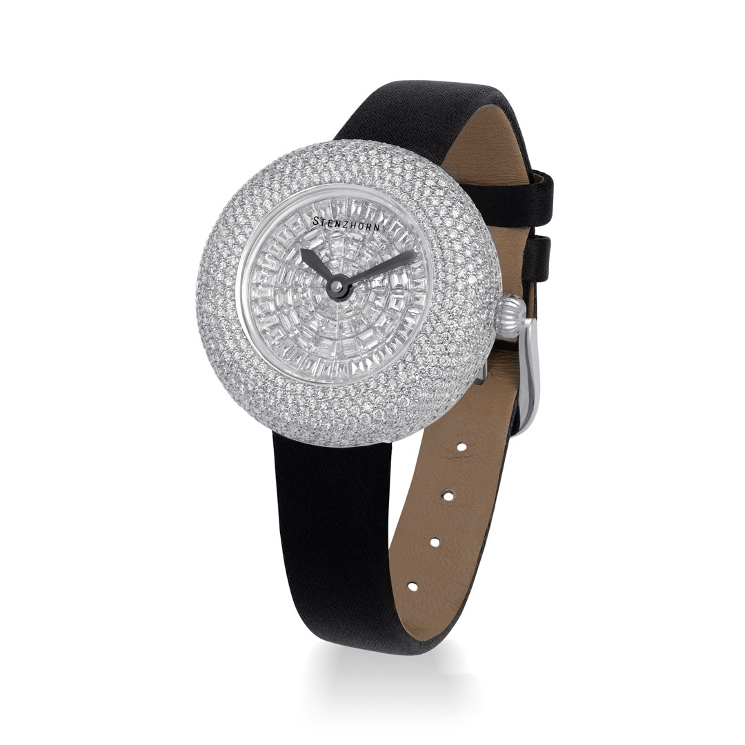 Die Zeit steht still mit einem unsichtbar gefassten Diamantzifferblatt, eingerahmt von einer Lünette aus 18 Karat Weißgold und Diamantpavé. Diese Uhr ist mit Automatik oder Quarz Werk erhältlich