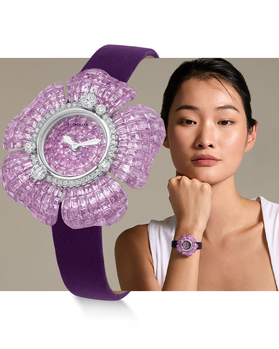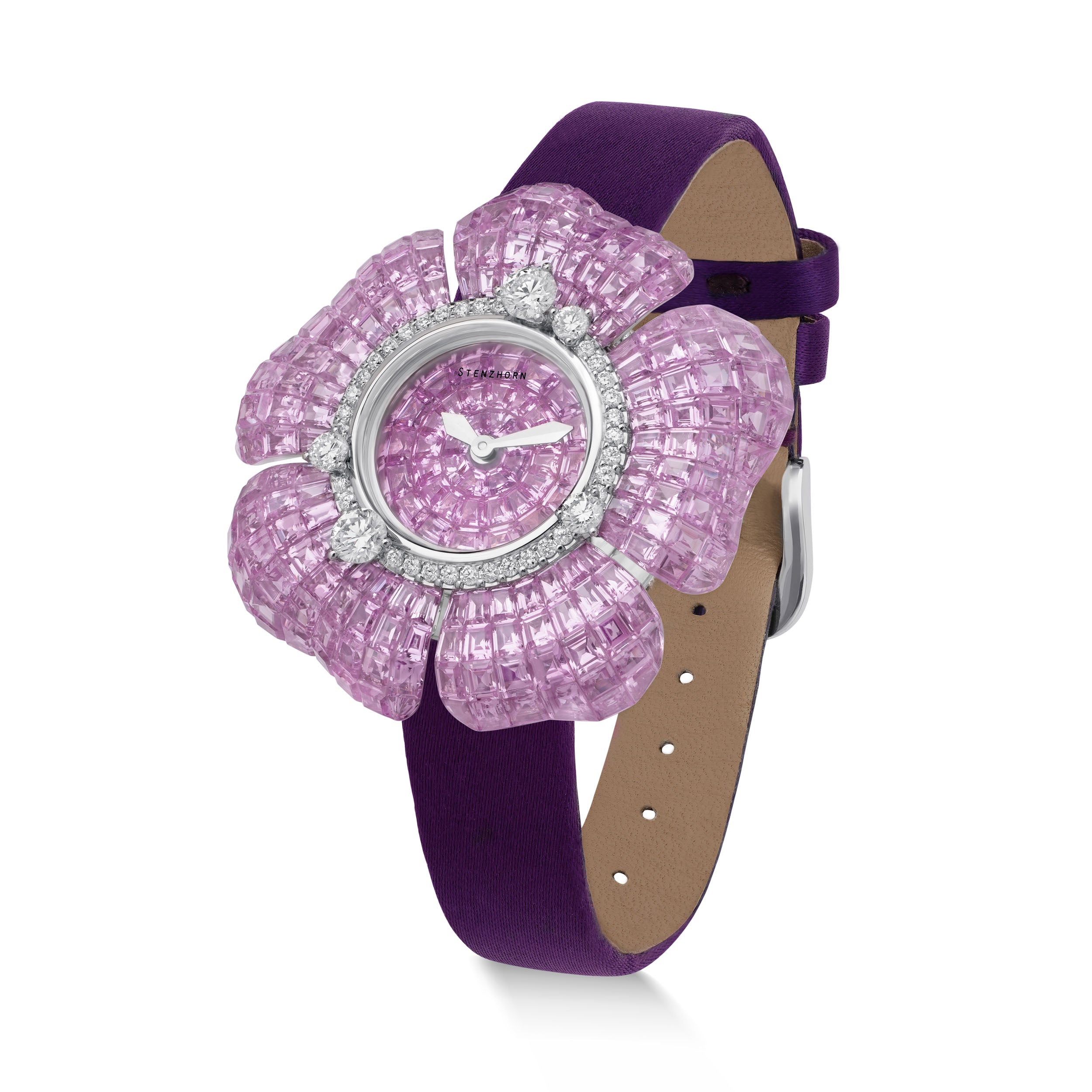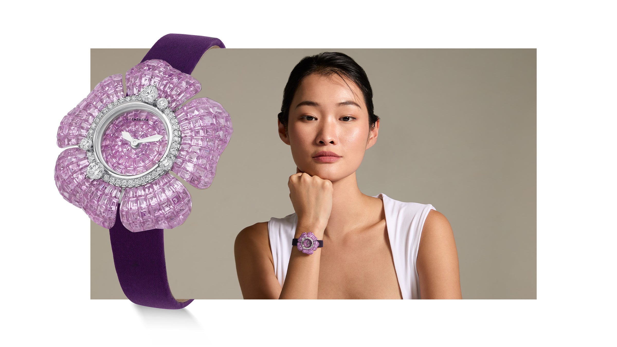 花卉腕表问世,完美无瑕的花瓣以最迷人的方式展现大自然的瑰宝。这款手表完美融合了史坦佐恩标志性的镶满宝石的花朵和精湛的工艺。受著名的 Floral 系列启发,Floral 手表以柔美的隐形镶嵌红宝石、珍贵的蓝宝石花瓣和闪亮的钻石将美提升到新的高度。