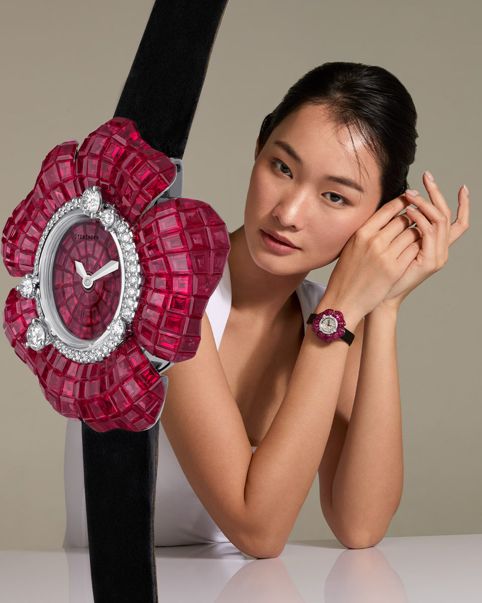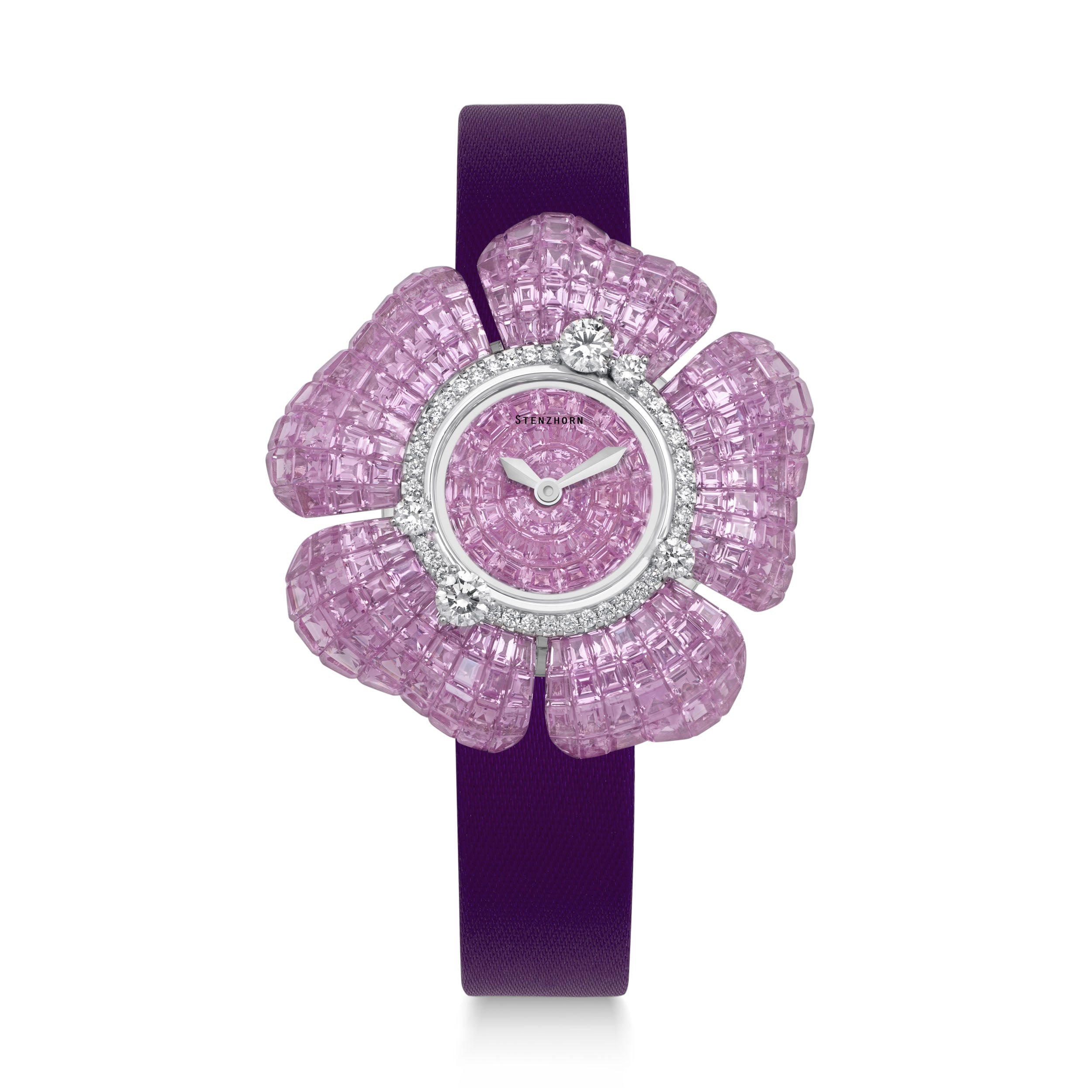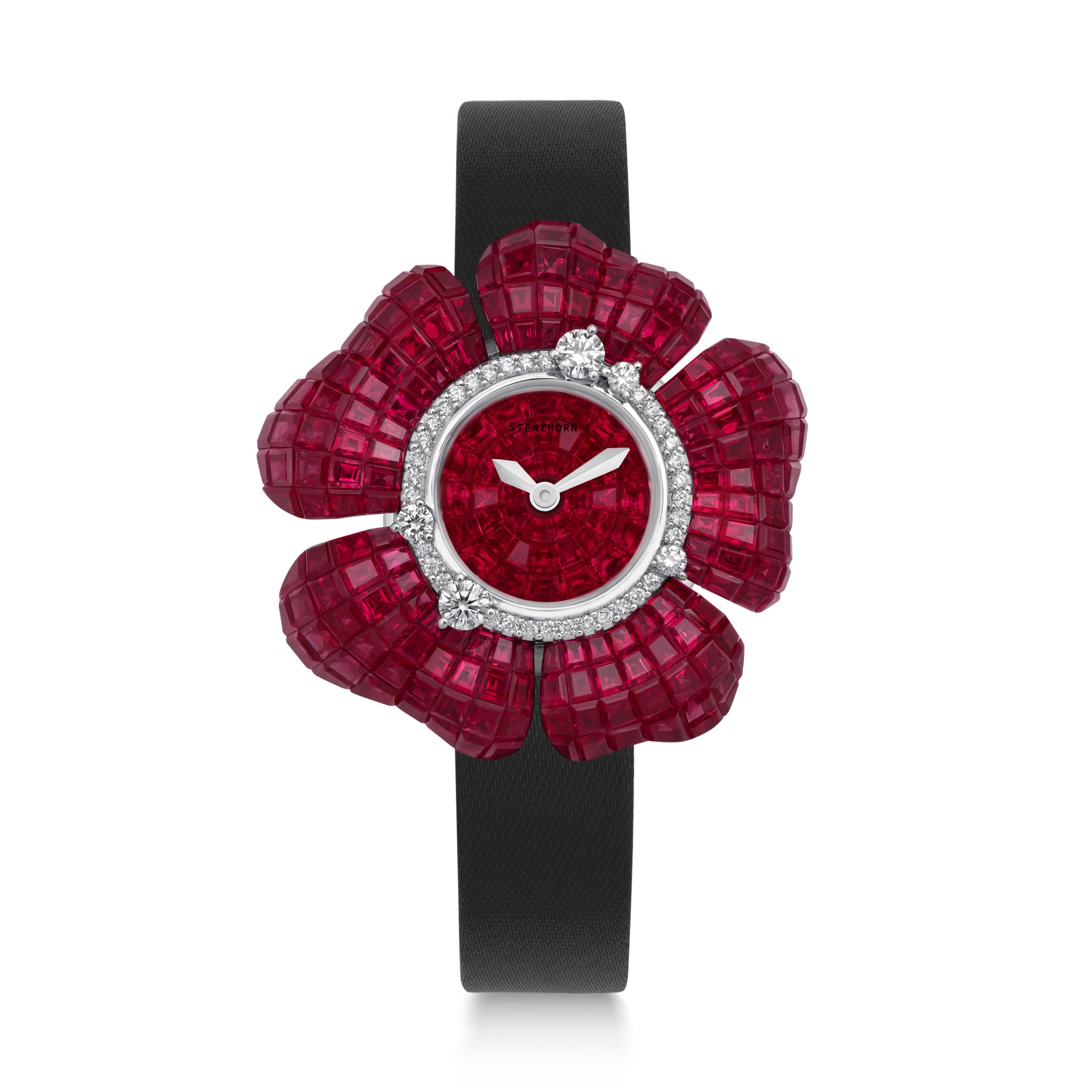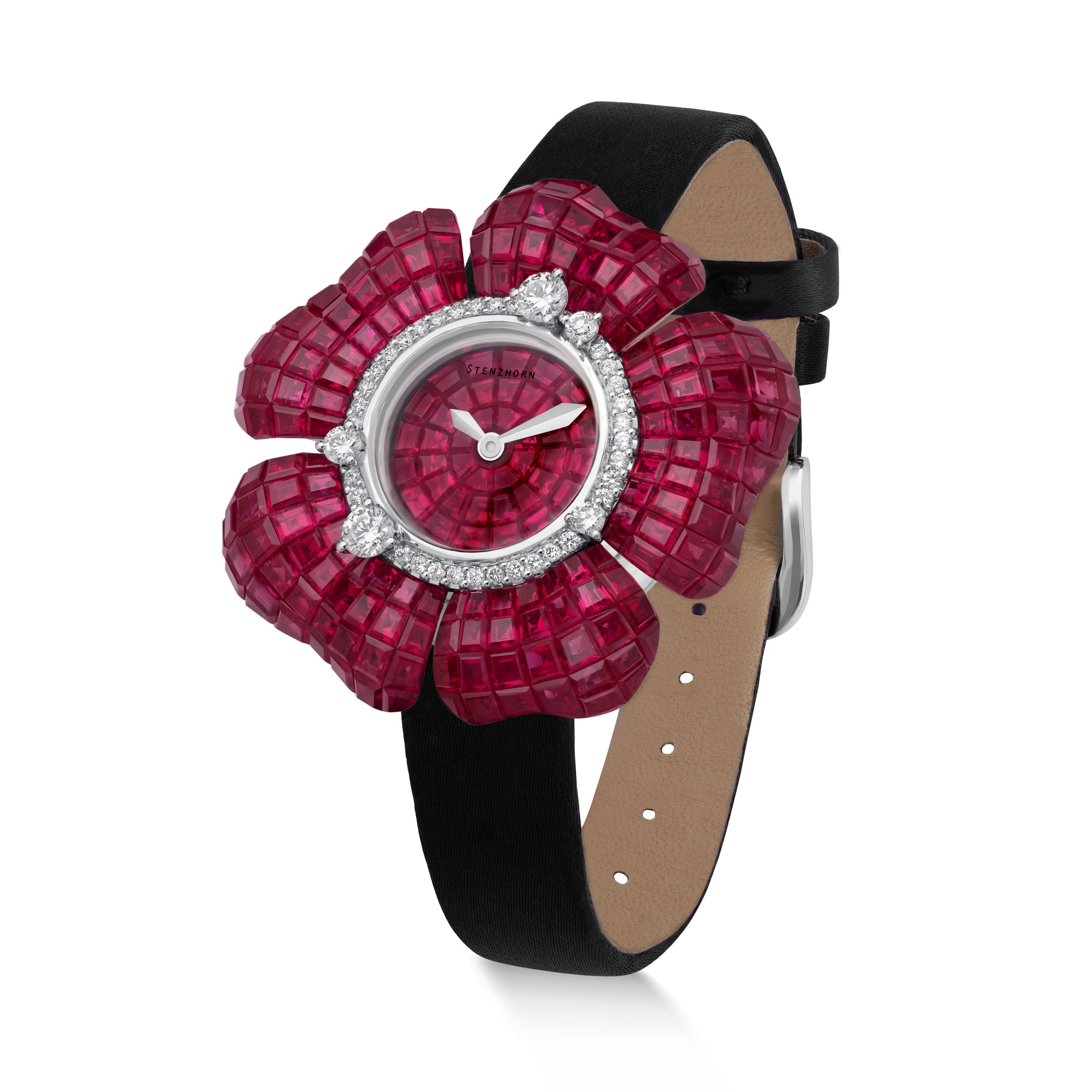 花卉腕表问世,完美无瑕的花瓣以最迷人的方式展现大自然的瑰宝。这款手表完美融合了史坦佐恩标志性的镶满宝石的花朵和精湛的工艺。受著名的 Floral 系列启发,Floral 手表以柔美的隐形镶嵌红宝石、珍贵的蓝宝石花瓣和闪亮的钻石将美提升到新的高度。