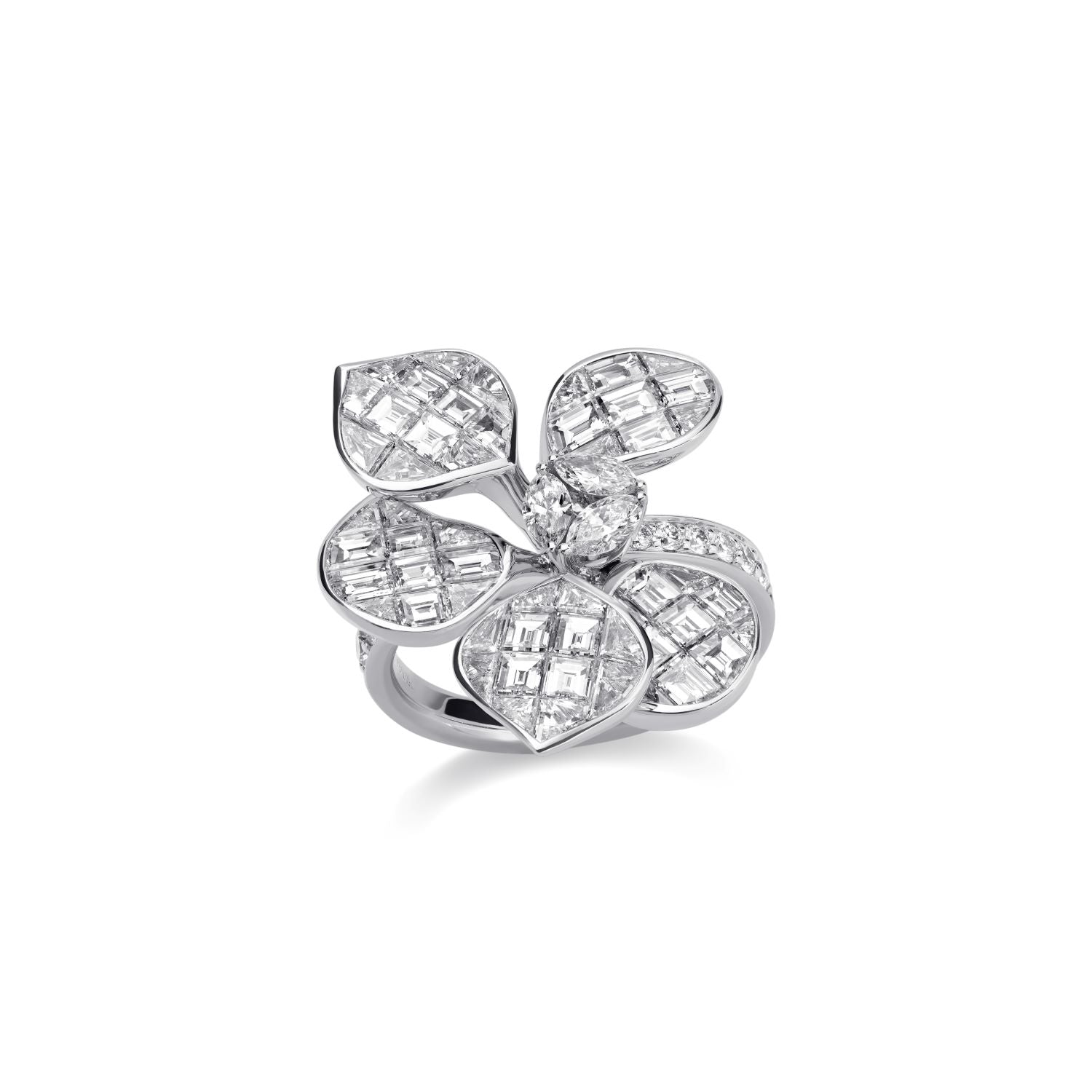 This unparalleled moment has been immortalised through an exceptional high-jewellery collection that encapsulates the very essence of this exquisite scene. The collection showcases a vibrant fusion of intricate petals adorned with glistening diamonds, pink sapphires and invisibly set rubies.