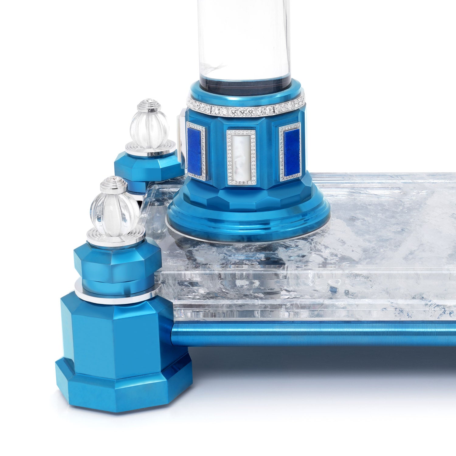 这枚精美绝伦的作品由极其罕见的柱状水晶制成,并镶嵌在水晶底座上,表面精心镶嵌了 23.78 克拉的钻石、青金石、月光石和 18K
