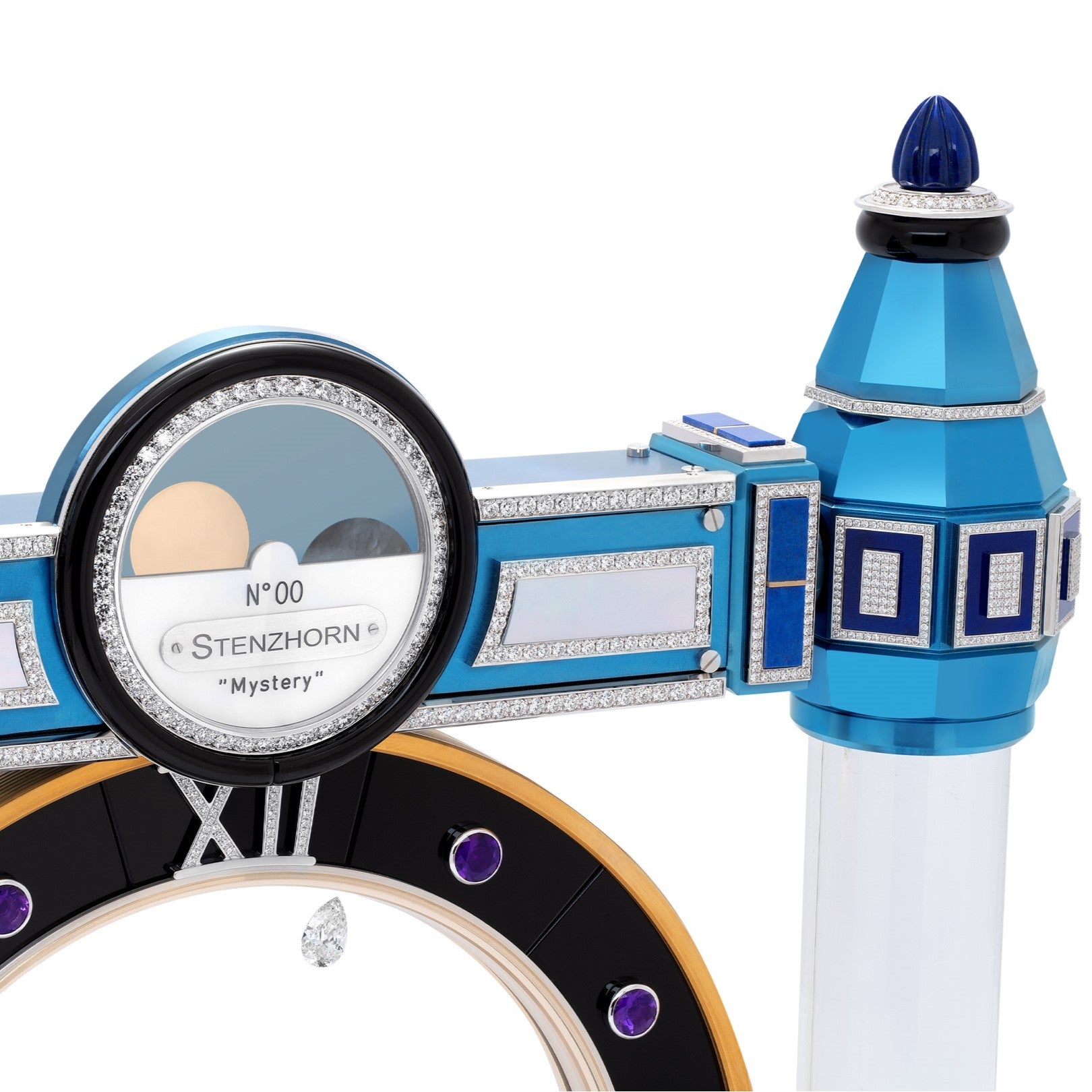 一颗悬浮的 1.5 克拉梨形钻石不断旋转以显示小时,精致的紫水晶则在表圈上标出 12 小时的位置。分钟显示确保了精确的时间测量,60 分钟后分针归零。
